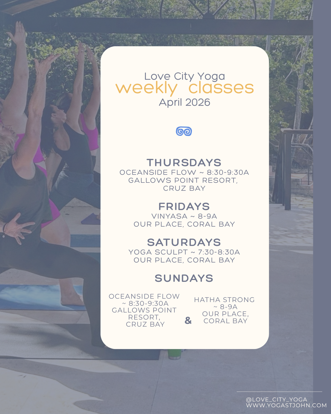 Love city yoga has multiple classes in one of the most gorgeous locations you can think of, a cool breeze with fresh herbs all around and wonderful instructors! My favorite is the Wednesday 9:30 class with Eliza. They also have visiting instructors who help keep the rotation fresh! 5 star’s baby’. - Vince Alterio